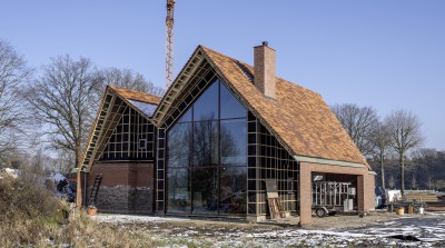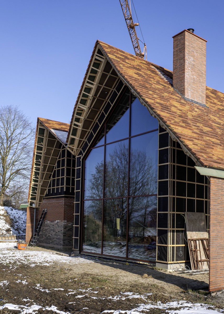 Het betreft de woning die aannemersbedrijf Warmes bouwt voor de familie Kamphuis aan de Roepenbeltweg in het buitengebied van Rossum (Ov). Over het bijzondere ontwerp interviewden we architect Witstaart al eens. Klik hier voor dat artikel.