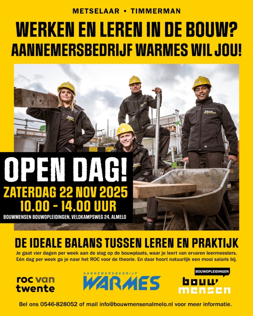 Lees verderOpleider Bouwmensen houdt open dag in Almelo op zaterdag 22 november. Iedereen met interesse in een loopbaan in de bouw is welkom.