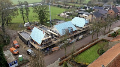 Er wordt hard gewerkt aan de bouw van de vier woningen in het centrum van het dorp. We hebben wat tijd verloren door onder meer de Japanse duizendknoop, maar die exoot is goed verwijderd op de locatie. Inmiddels gaat de bouw weer in sneltreinvaart. Het metselwerk is opgetrokken tot aan de muurplaten – de borstwering van de eerste verdieping – zodat de kappen geplaatst konden worden.