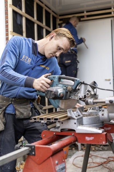 “Het begint met niveau 2 timmerman en na 2 jaar stroom je door naar niveau 3 allround timmerman. Eerst een paar weken bij Bouwmensen op school en daarna ga je aan het werk. Vier dagen werken, een dag naar school.”