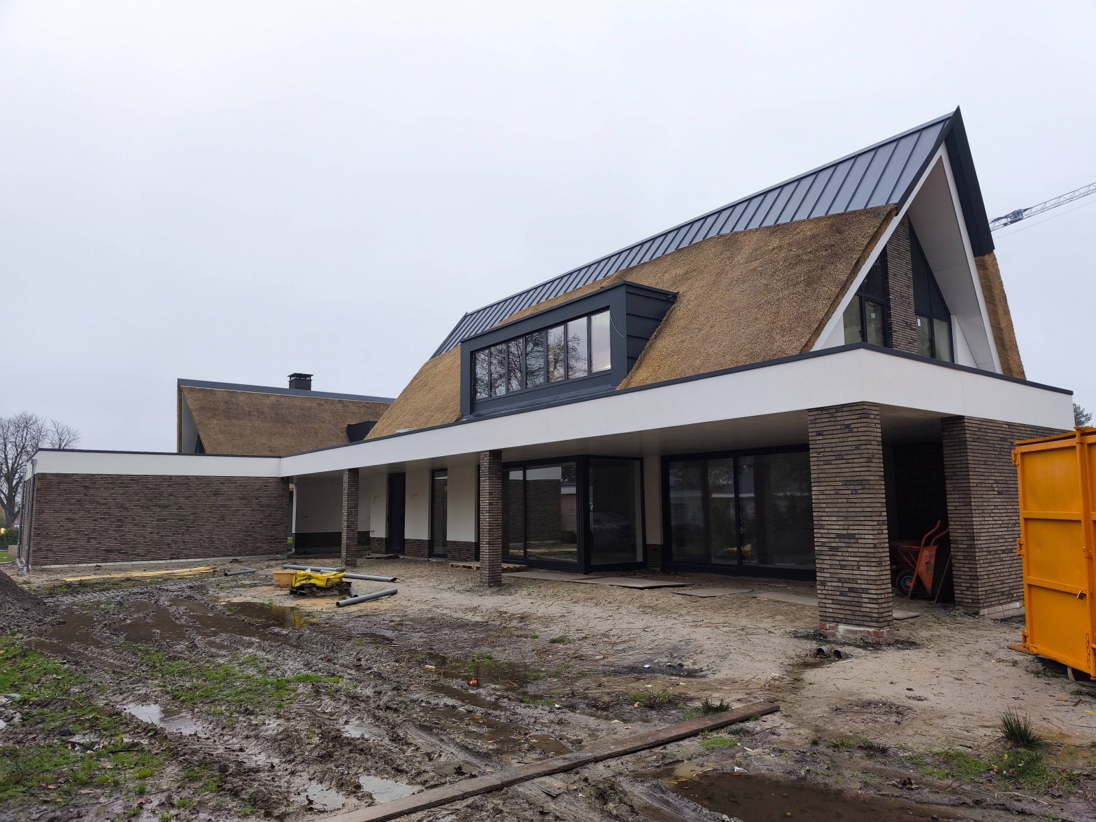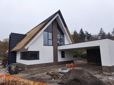 De kleuren en de beplating, de kozijnen, de stenen en het riet vormen een harmonieus geheel. Het effect wordt straks nog sterker als de bestrating en de beplanting er is.